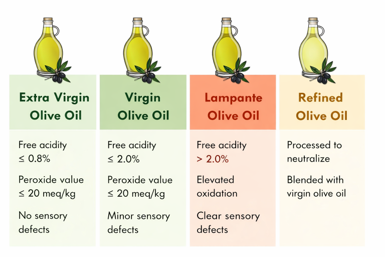 Olive oil is officially classified into categories based on its chemical parameters and sensory characteristics. Each category reflects measurable differences in acidity, oxidation, and overall chemical integrity.